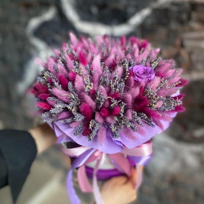 Шляпная коробка – 1 шт.Оазис – 1 шт.Лагурус – 240 шт.лаванда (банч) – 2 шт.Тишью – 2 шт.Стабилизированная роза – 1 шт.Лента – 2 шт.