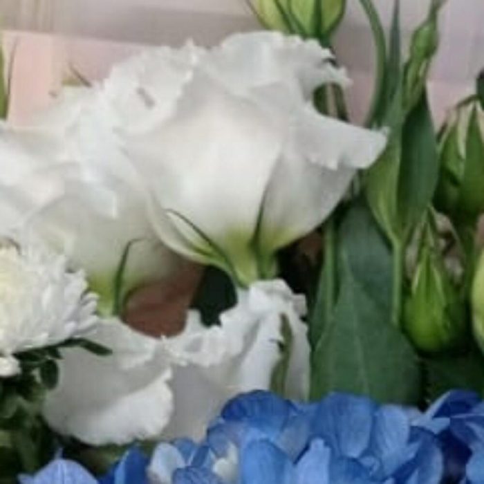 Гортензия голубая – 1 шт. Лизиантус Алиса белый – 3 шт. Гербера белая – 2 шт. Роза кустовая – 2 шт.