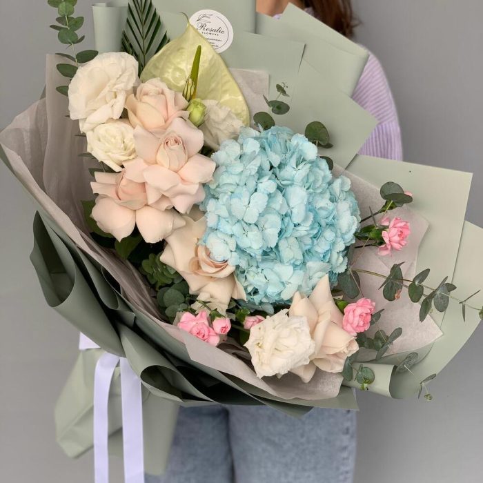 Альстромерии, Гортензии, Кустовые розы, Лизиантусы, Розы, Хризантемы