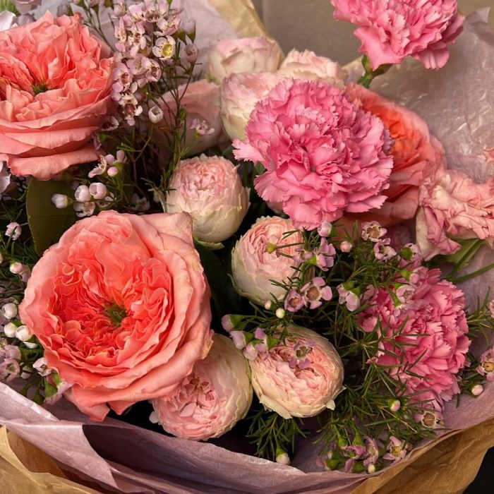 Роза пионовидная – 3 шт.Роза пионовидная кустовая – 2 шт.Гвоздика – 3 шт.Маттиола – 2 шт.Ваксфлауэр – 3 шт.Лизиантус – 1 шт.Упаковка дизайнерская – 1 шт.