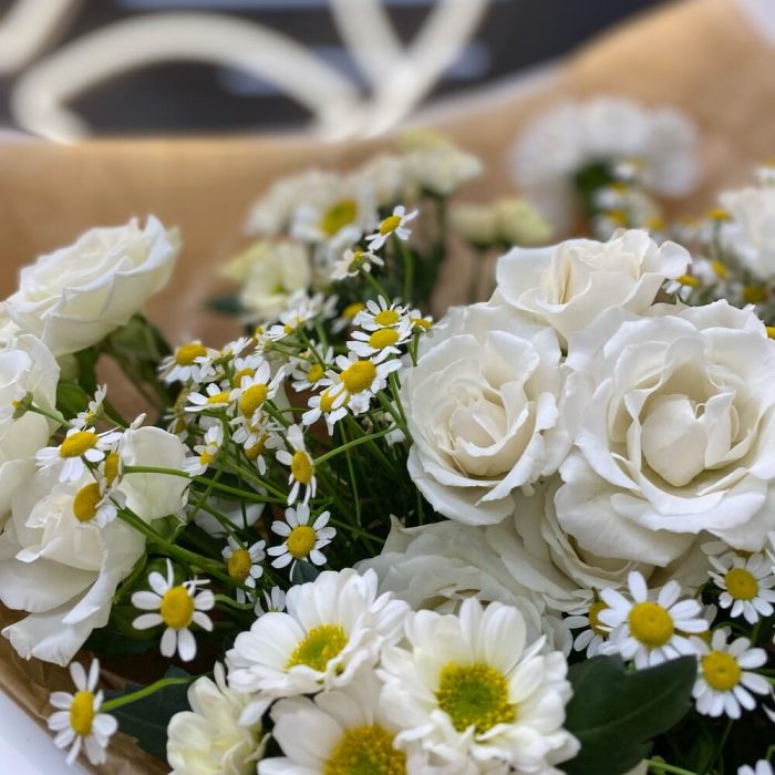 Матрикария – 3 шт.Гвоздика – 2 шт.Роза кустовая – 2 шт.Сантини – 3 шт.Фисташка – 2 шт.