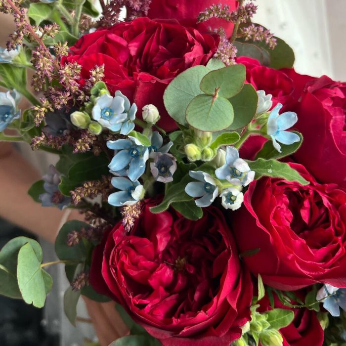 Астильба – 5 шт.Эвкалипт – 5 шт.Пионовидная роза – 9 шт.Атласная лента – 2 шт.Оксипеталум – 7 шт.