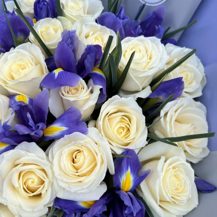 Ирис Blue Magic – 14 шт.Роза белая 60 см – 21 шт.дизанерская упаковка – 5 шт.Тишью – 1 шт.Лента атласная – 2 шт.