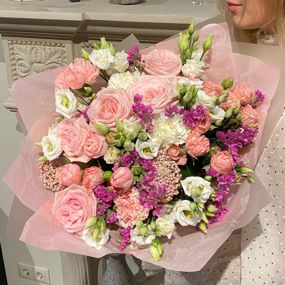 Озотамнус – 2 шт.Статица – 5 шт.Эустома – 5 шт.Фирменная упаковка – 1 шт.диантусы – 5 шт.madam bombastic – 3 шт.pink o’hara роза – 5 шт.