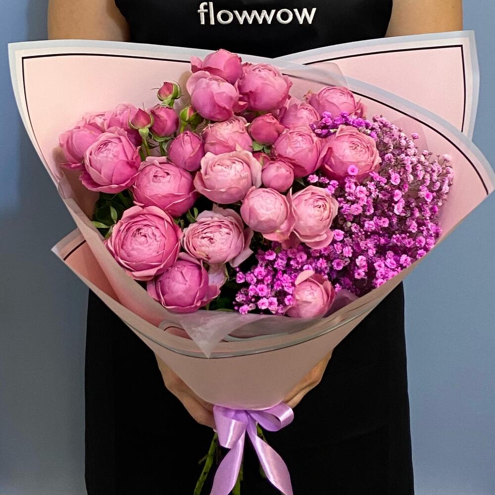 Букет пионовидных роз с гипсофилой
