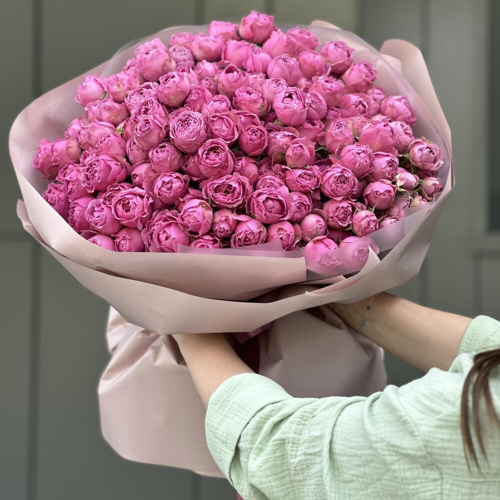 Роскошный букет пионовидных кустовых роз в оформлении!