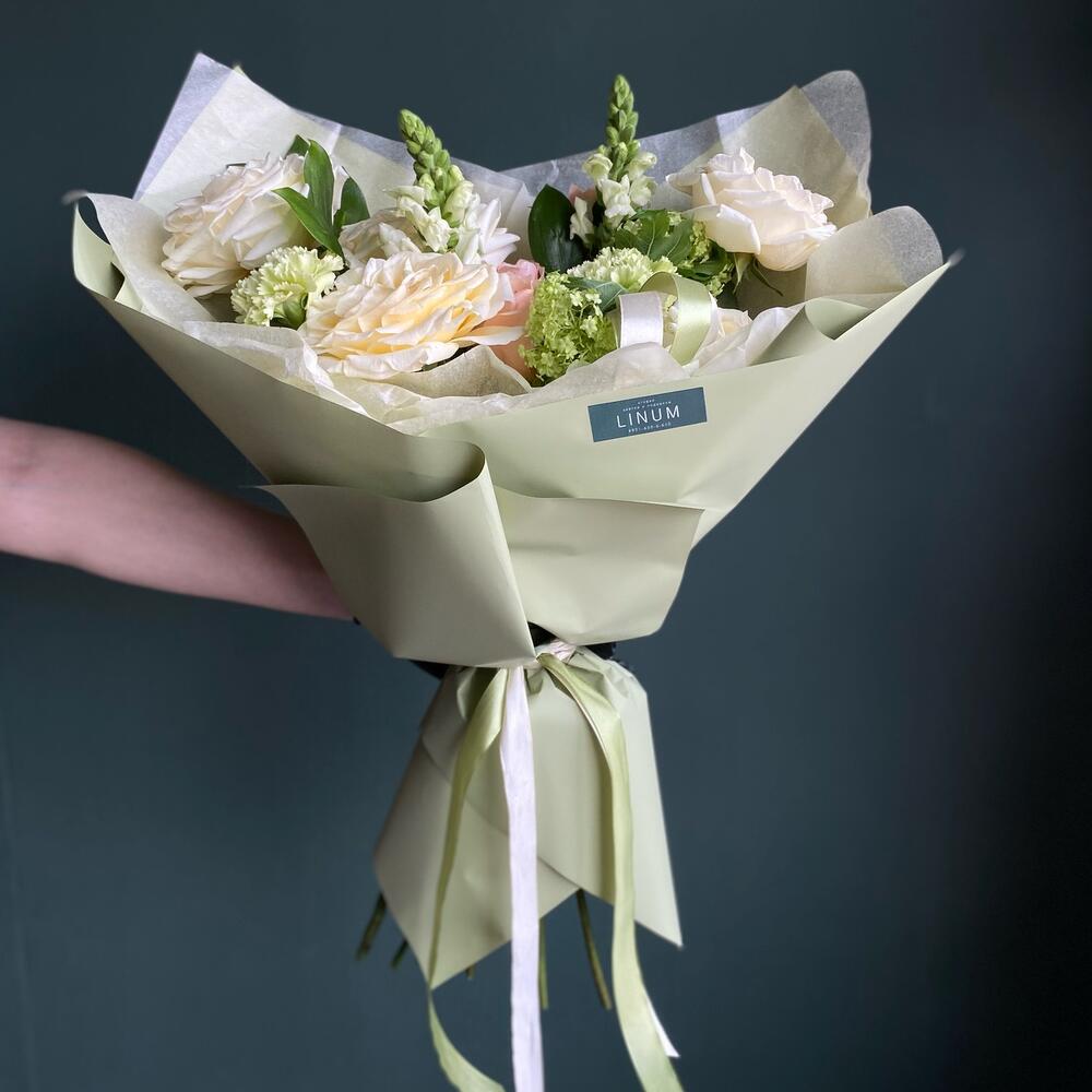 кендилайт – 5 шт.Вибурнум – 1 шт.Рускус – 3 шт.антиринум – 3 шт.Гвоздика – 3 шт.Упаковка дизайнерская – 1 шт.уходовое средство для цветов – 1 шт.транспортировочная упаковка – 1 шт.роза кустовая шиммер – 3 шт.