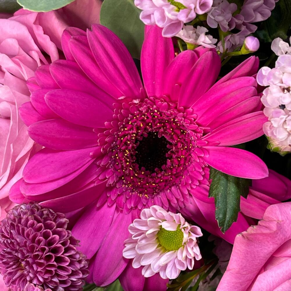 Ваксфлауэр – 3 шт.Лента – 2 шт.Рускус – 3 шт.Эвкалипт – 1 шт.Роза одноголовая – 7 шт.Гербера мини – 3 шт.Аквабокс – 1 шт.Пакет подарочный – 1 шт.Лагурус – 7 шт.хризантема сантини росси пинк – 2 шт.хризантема пурпетта – 3 шт.