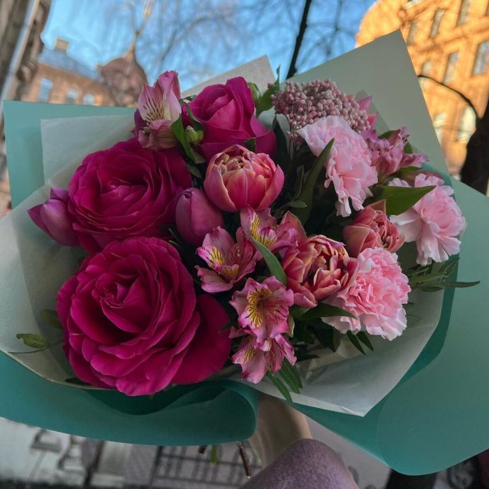роза ароматная Pink Floyd – 3 шт.Тюльпан розовый – 7 шт.Диантус розовый – 3 шт.Альстромерия розовая – 3 шт.Фисташка пучок – 2 шт.Озотамнус розовый – 1 шт.Упаковка дизайнерская – 2 шт.