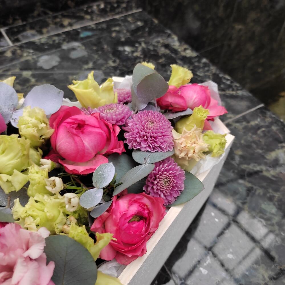 Роза кустовая пионовидная – 2 шт.Лизиантус – 2 шт.Хризантема кустовая – 1 шт.Ваксфлауэр – 1 шт.Эвкалипт – 1 шт.ящик сердце деревянный – 1 шт.