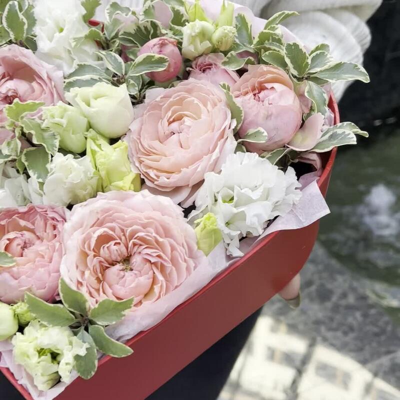 Роза кустовая пионовидная – 2 шт.Питтоспорум – 2 шт.Лизиантус – 3 шт.Коробка сердце – 1 шт.