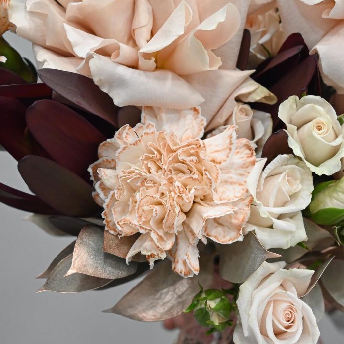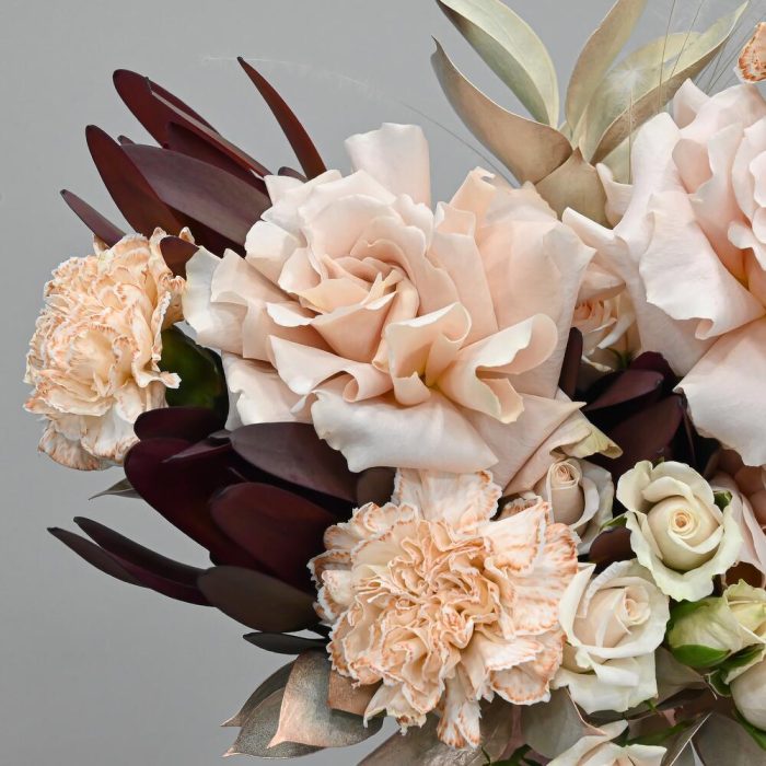 Лента – 1 шт.Роза кустовая – 3 шт.Рускус – 7 шт.Гвоздика – 4 шт.Французская роза – 3 шт.Стифа – 3 шт.леукондендрон – 3 шт.