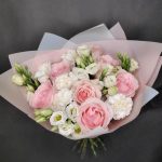 Лизиантус – 4 шт.Роза Эквадор – 7 шт.Лента атласная – 1 шт.Диантус – 5 шт.Упаковка дизайнерская – 5 шт.