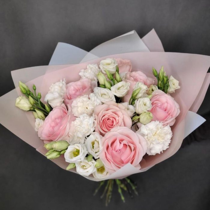 Лизиантус – 4 шт.Роза Эквадор – 7 шт.Лента атласная – 1 шт.Диантус – 5 шт.Упаковка дизайнерская – 5 шт.