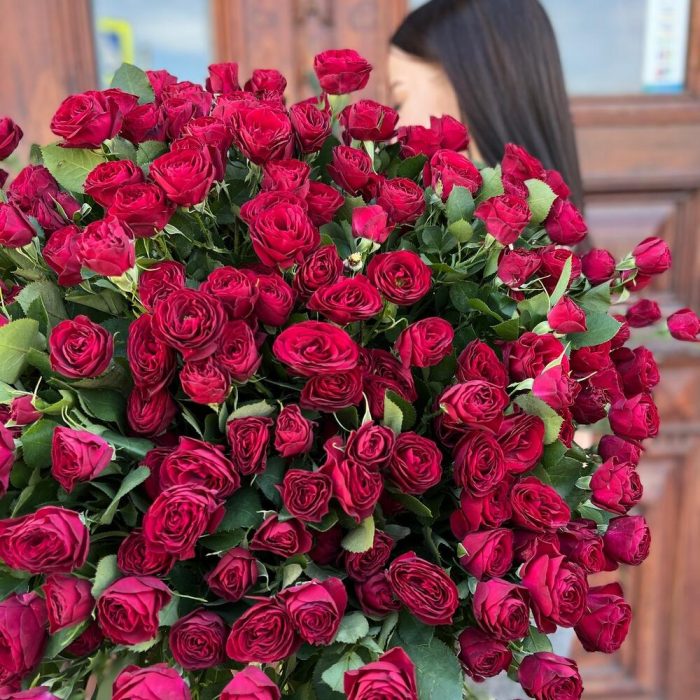 Лента атласная – 2 шт.Пленка матовая – 5 шт.роза кустовая ред трендсеттер – 5 шт.