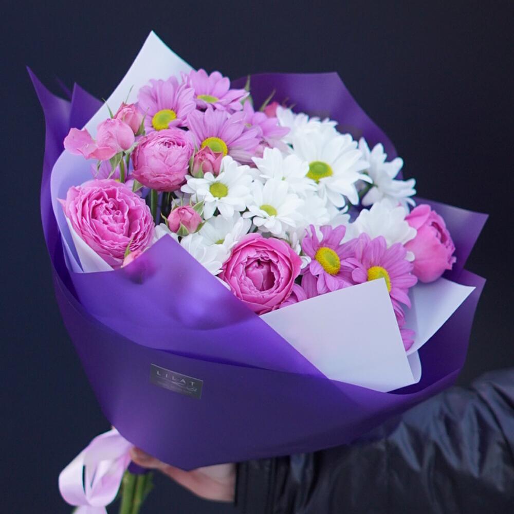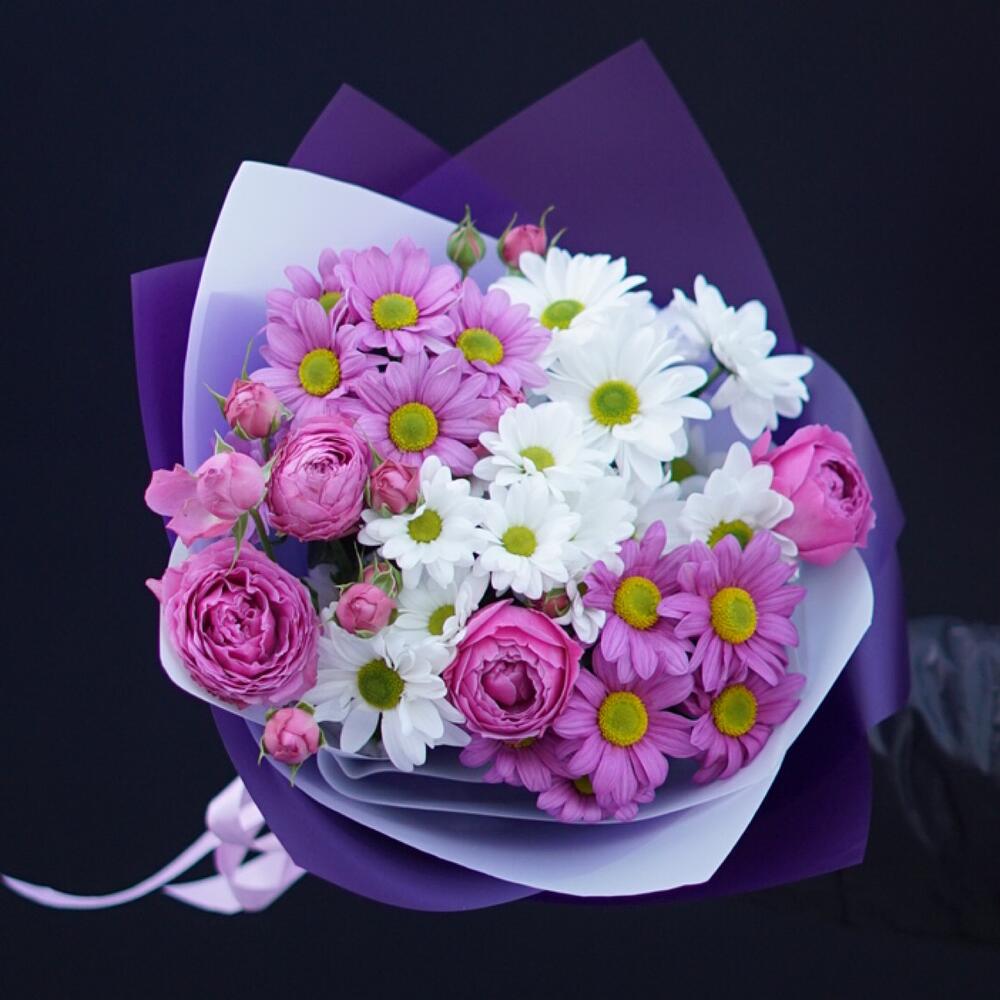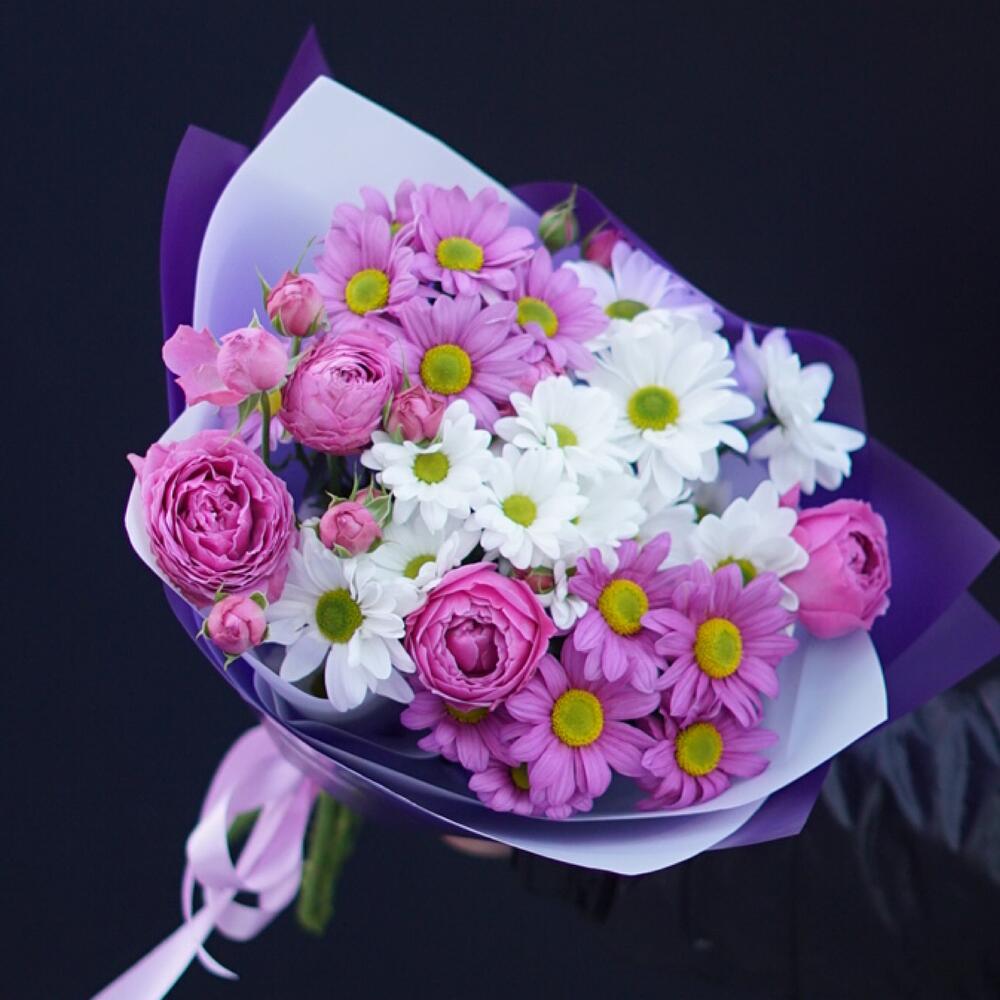 Хризантема кустовая – 5 шт. мистик баббл роза кустовая – 3 шт. Упаковка дизайнерская – 2 шт. Открыточка с вашими пожеланиями – 4 шт. инструкция по уходу за цветами – 1 шт.