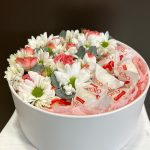 Пиафлор (оазис) – 1 шт.Роза кустовая – 2 шт.Хризантема кустовая – 1 шт.Раффаэлло – 8 шт.Коробка – 1 шт.Упаковка дизайнерская – 2 шт.зелень декоративная – 1 шт.
