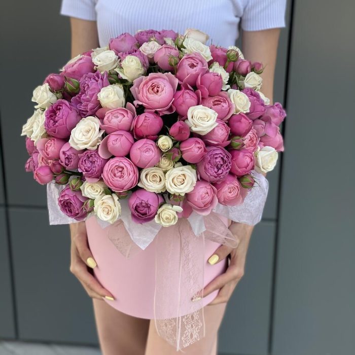 Оазис – 2 шт. Коробка – 1 шт. Кустовая пионовидная роза – 21 шт.