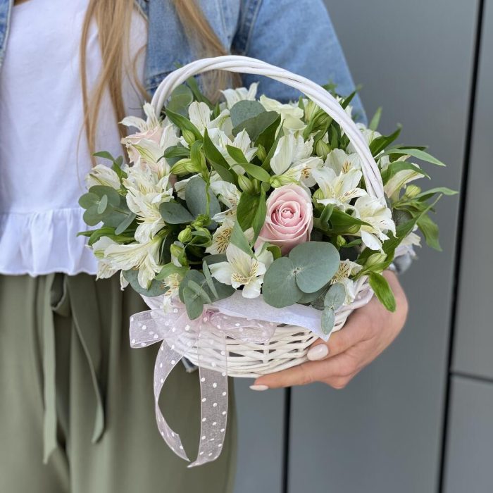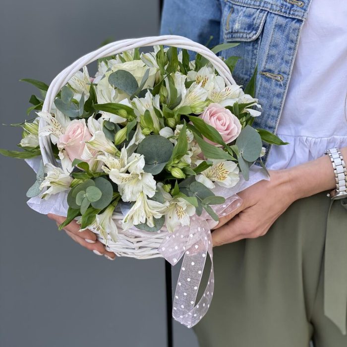 Корзинка из роз и альстромерии с эвкалиптом!