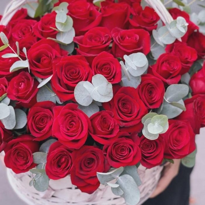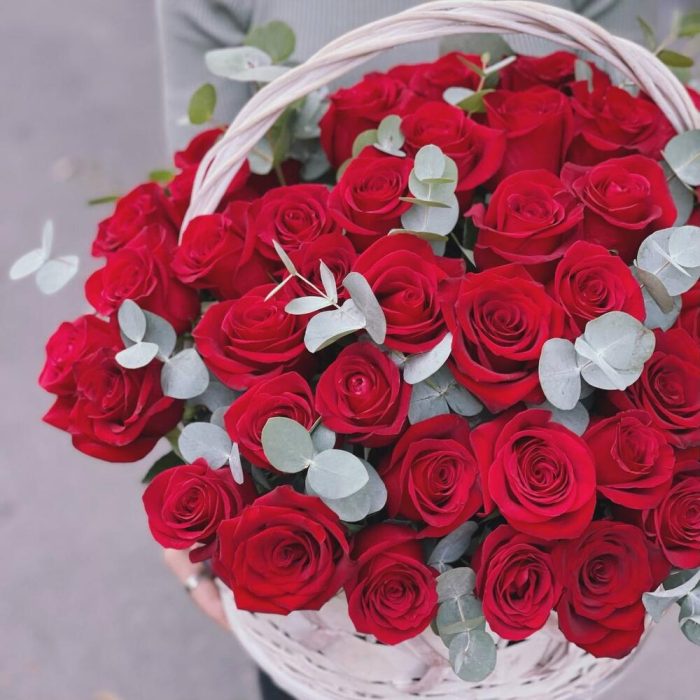 Плетеная корзина – 1 шт.Красная роза – 51 шт.Эвкалипт – 5 шт.Оазис флористический – 3 шт.