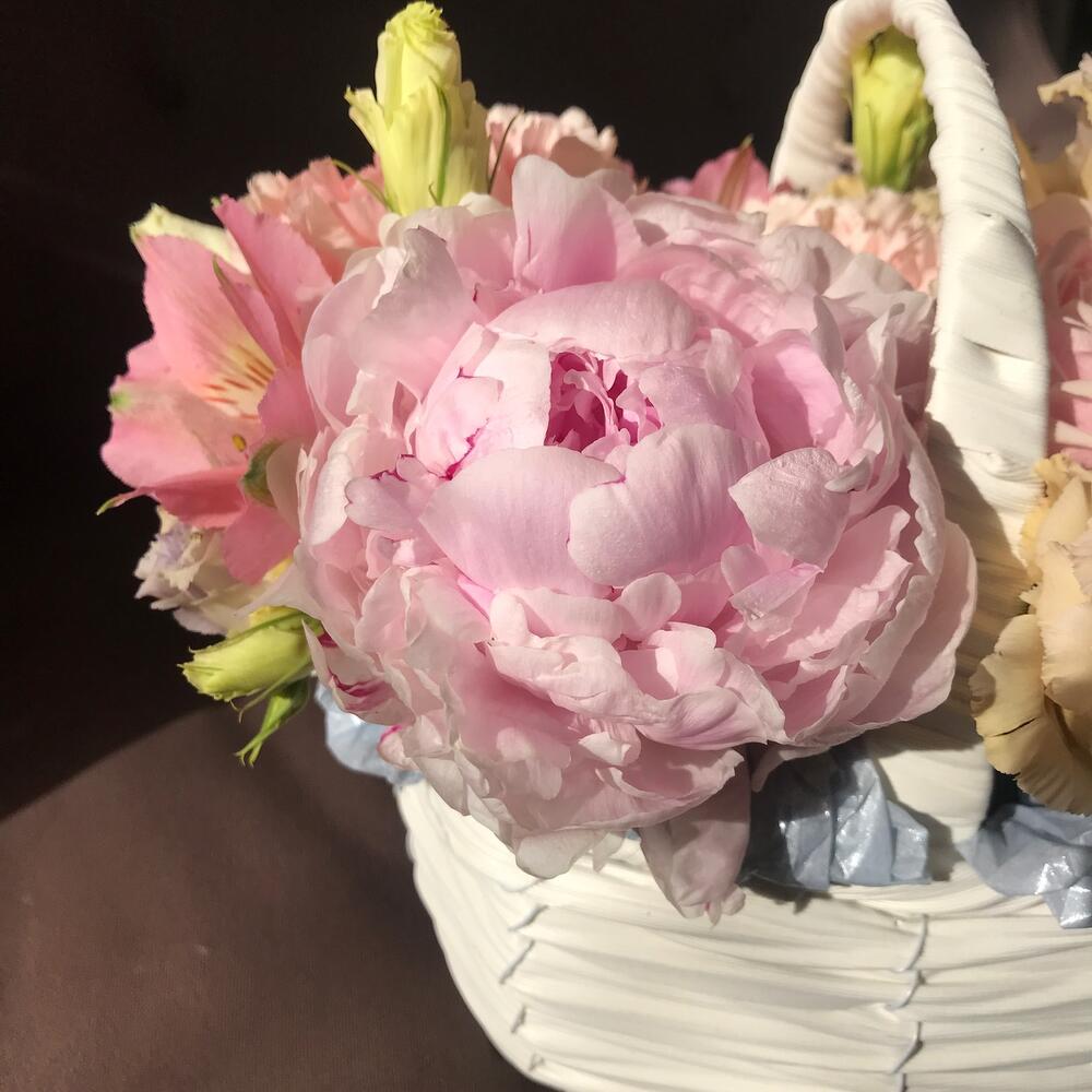 Корзина плетеная – 1 шт.Губка флористическая – 1 шт.Пион Сара Бернар – 1 шт.Роза розовая – 1 шт.Эустома – 2 шт.Гвоздика – 5 шт.