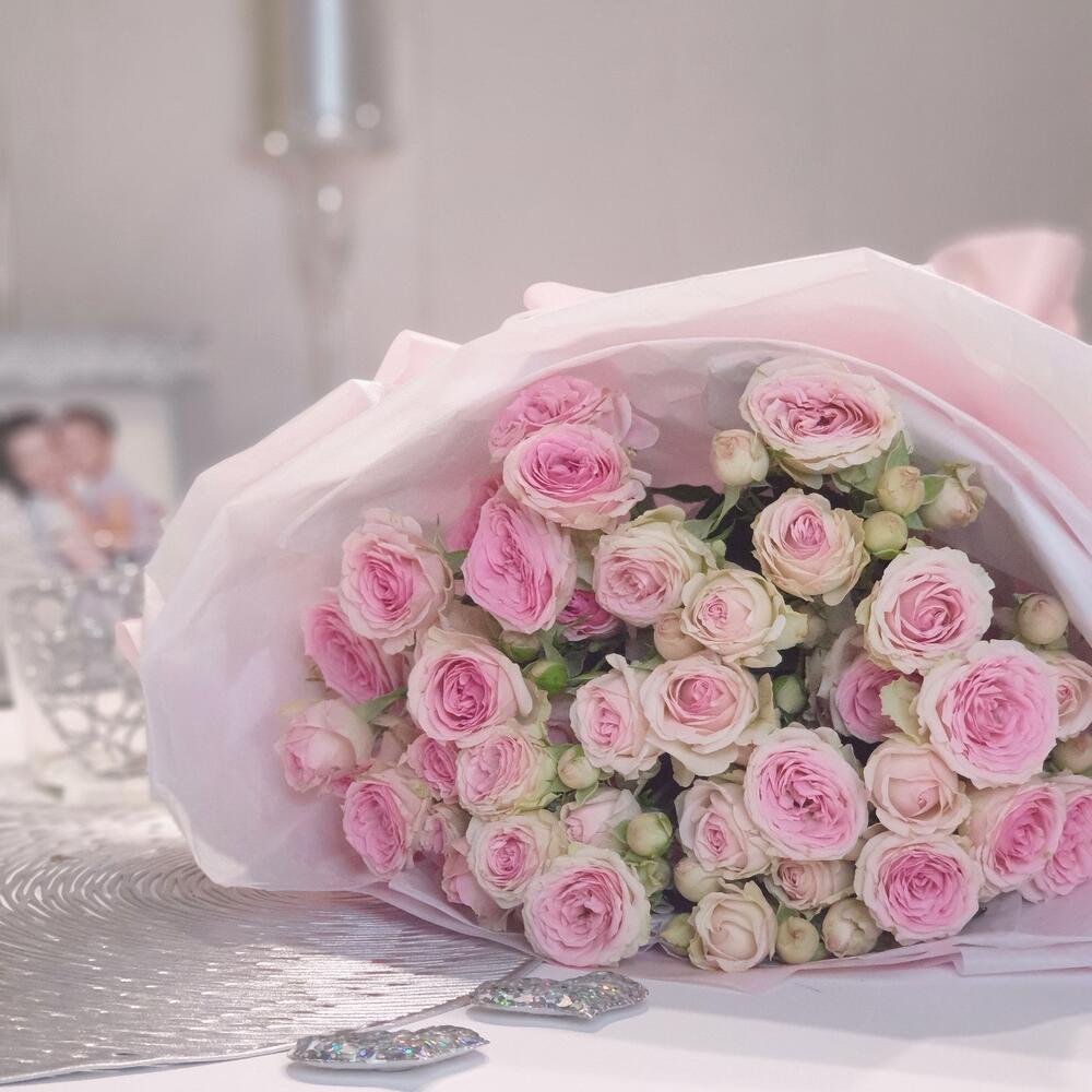 Лента атласная – 1 шт.Роза кустовая пионовидная – 7 шт.Пленка матовая – 1 шт.Открыточка с вашими пожеланиями – 1 шт.Тишью белое – 4 шт.любовь флориста (бесплатно) – 1 шт.