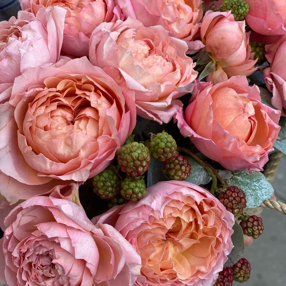 Эвкалипт – 3 шт.Роза кустовая пионовидная – 5 шт.кашпо джутовое ручной работы – 1 шт.