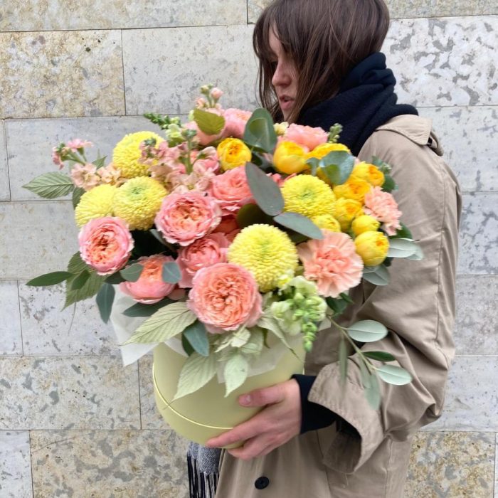 Роза пионовидная кустовая – 7 шт.Хризантема – 5 шт.Маттиола – 7 шт.Львиный зев – 3 шт.Эвкалипт – 7 шт.Ветки малины – 3 шт.Тишью – 2 шт.Шляпная коробка – 1 шт.Оазис флористический – 1 шт.