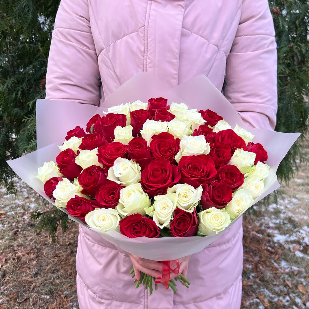 Роза красная – 26 шт.Роза белая – 25 шт.Пленка матовая – 1 шт.