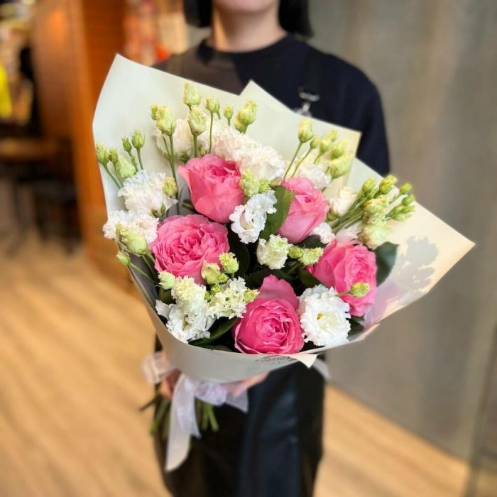 Роза розовая Эквадор – 5 шт.Эустома – 4 шт.