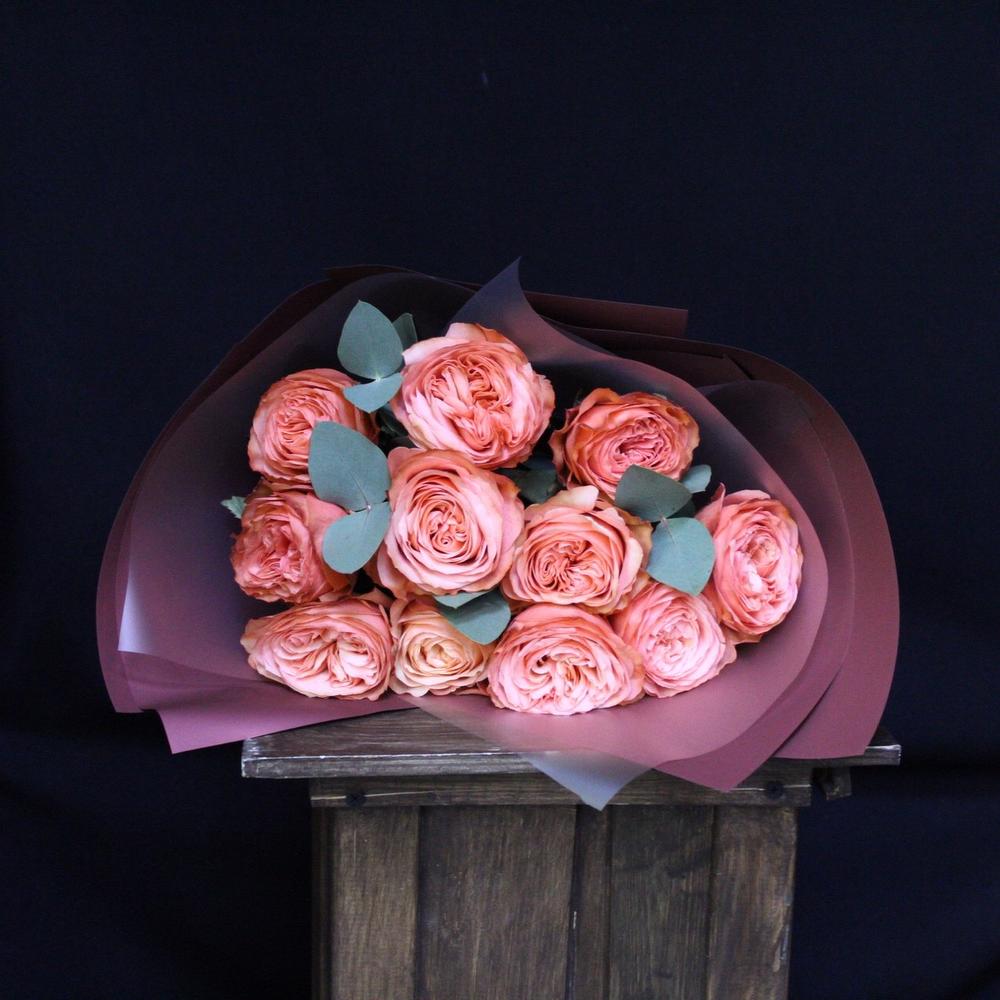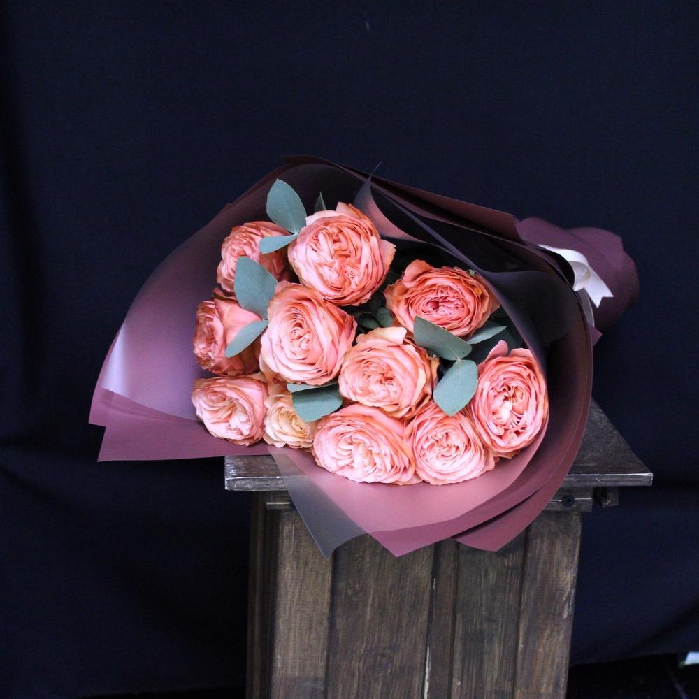 Роза пионовидная кахала – 11 шт.Эвкалипт – 3 шт.Пленка матовая – 5 шт.Лента атласная – 1 шт.