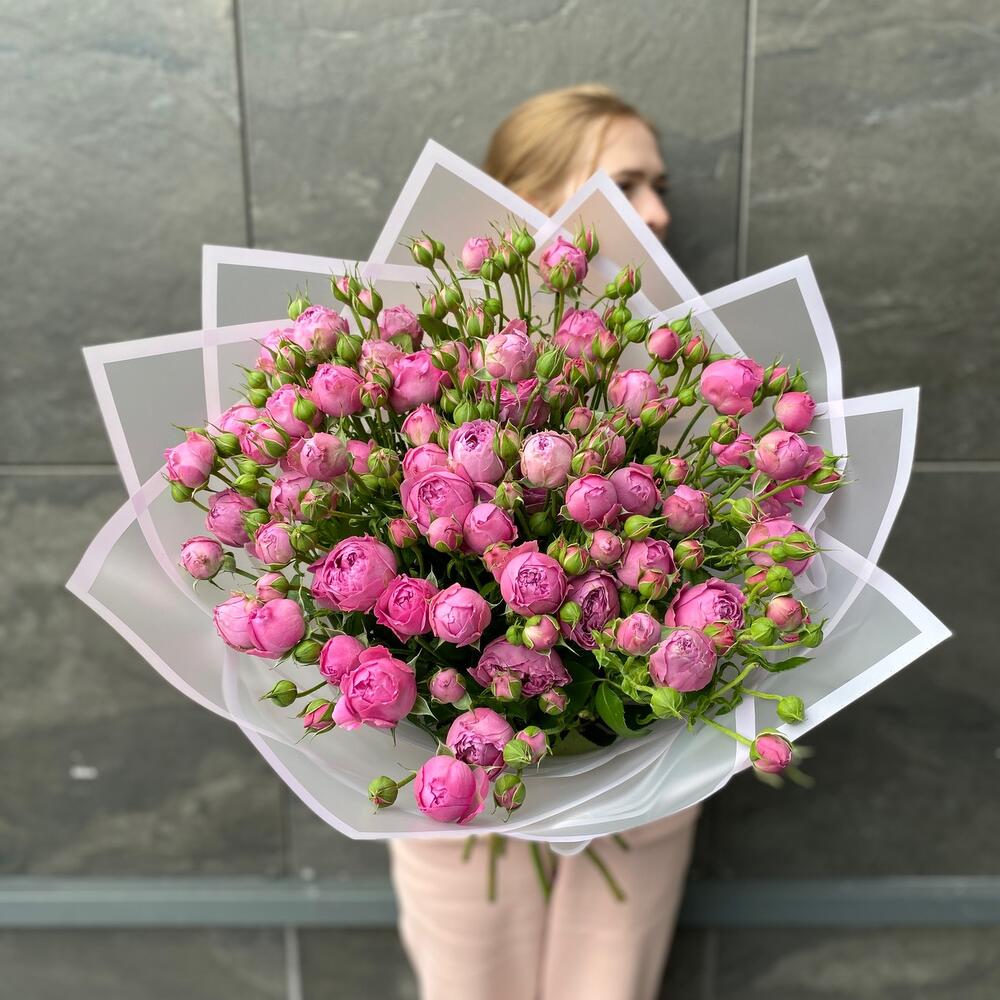 Лента атласная – 1 шт.Упаковка дизайнерская – 5 шт.роза кустовая пионовидная мисти бабл – 15 шт.