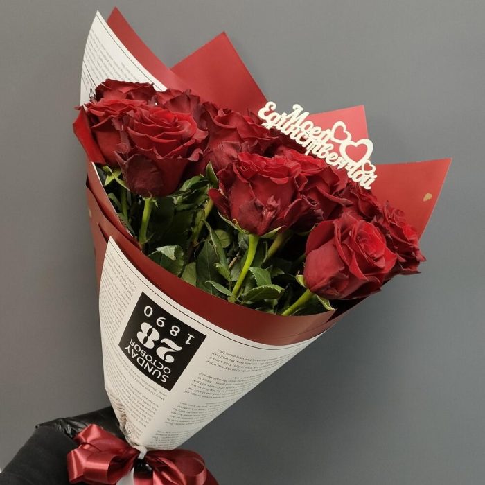Роза Эквадор Красная – 15 шт.Пленка – 1 шт.Топпер – 1 шт.