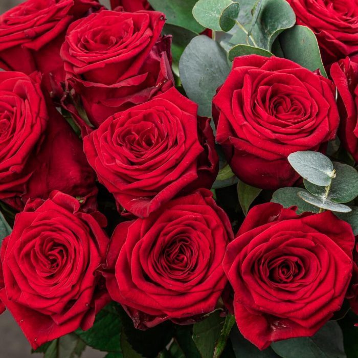 Монобукет в вазе из красных роз с эвкалиптом