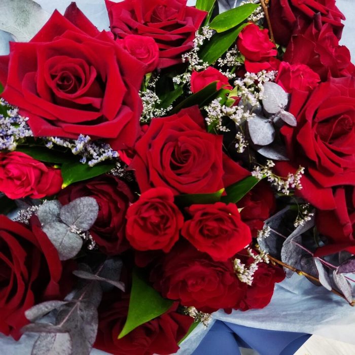 Лимониум – 3 шт.Роза кустовая – 4 шт.Рускус – 15 шт.Роза – 9 шт.Роза Кенийская – 6 шт.эвкалипта – 6 шт.Упаковка дизайнерская – 1 шт.Лента атласная – 3 шт.
