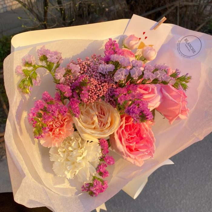 Кустовая роза – 1 шт.Диантус – 2 шт.Статица сиреневая – 5 шт.Тишью белое – 1 шт.Матовая упаковка – 1 шт.лента атласная белая широкая – 1 шт.озатомус – 1 шт.роза white o’hara – 1 шт.розы pink o’hara – 3 шт.