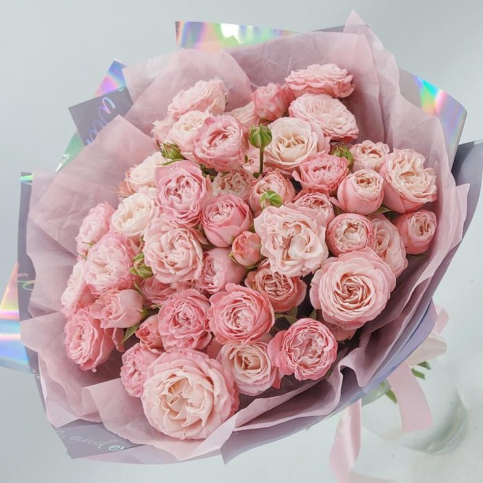 Нежные, пышные пионовидные кустовые розы Бомбастик в стильном, лаконичном монобукете – универсальный выбор по любому поводу или вовсе без повода. Можно преподнести маме, сестре, подруге, коллеге, любимой.
