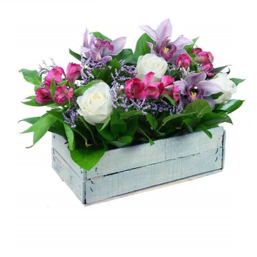 Листья салал – 1 шт.Рускус – 1 шт.Роза белая – 3 шт.Альстромерия розовая – 3 шт.oasis классик кирпич – 1 шт.Лимониум синий – 1 шт.Ящик деревянный – 1 шт.Цимбидиум розовый – 3 шт.