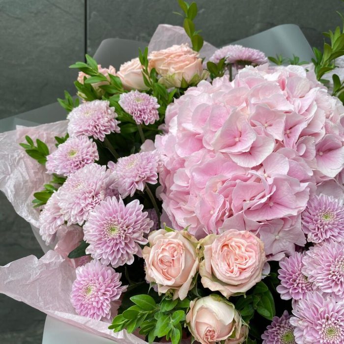 Нежный букет в розовых тонах. Отличное сочетание гортензии и пионовидной розы,с добавлением прекрасной сантини. Легкий воздушный букет станет отличным презентом на любое мероприятие: день рождения,свадьба или же просто коллеге по работе.