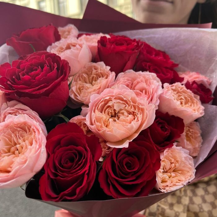 роза кения красная – 10 шт.роза пионовидных премиум джульетта – 5 шт.Лента атласная – 2 шт.Упаковка корейская пленка – 1 шт.