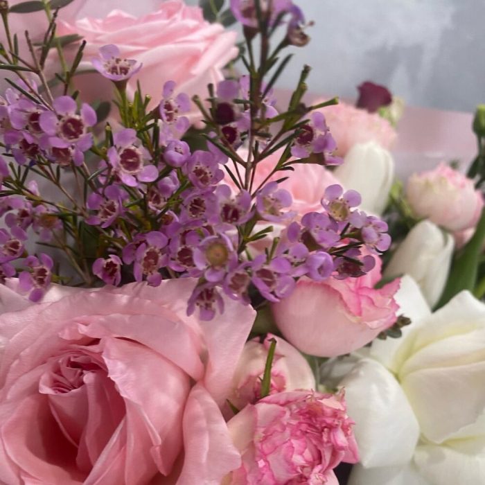 Ранункулюс – 3 шт.плая бланка роза – 3 шт.Pink O’Hara роза – 5 шт.Кустовая пионовидная роза – 2 шт.Тюльпан – 3 шт.Хамелациум – 2 шт.Эустома – 3 шт.Эвкалипт Микс – 3 шт.Упаковка дизайнерская – 5 шт.Лента атласная – 1 шт.