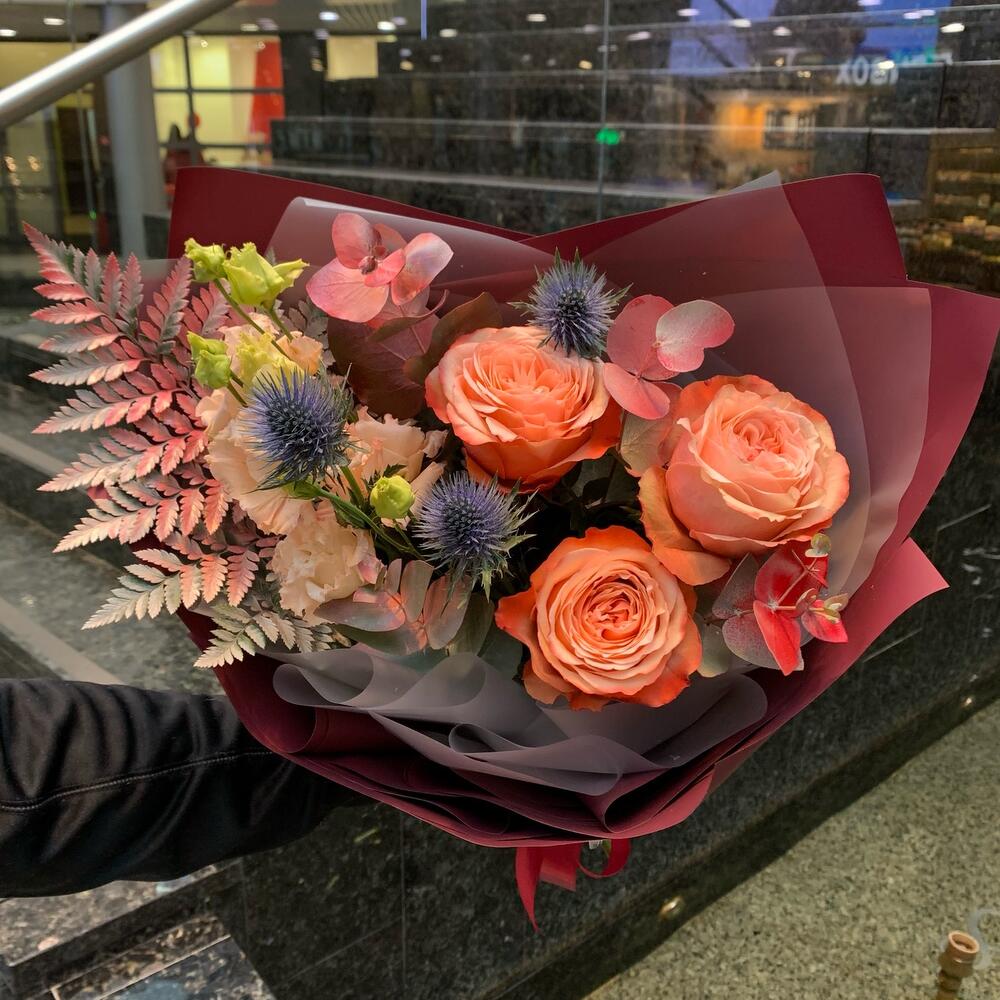 кахала роза пионовидная – 3 шт.Эрингиум синий – 1 шт.эустома персиковая – 1 шт.Эвкалипт – 1 шт.