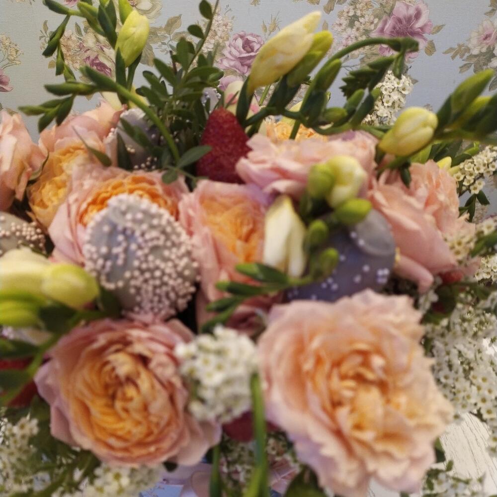 Вкусный букет из клубники в шоколаде с розами ” Нежный поцелуй”