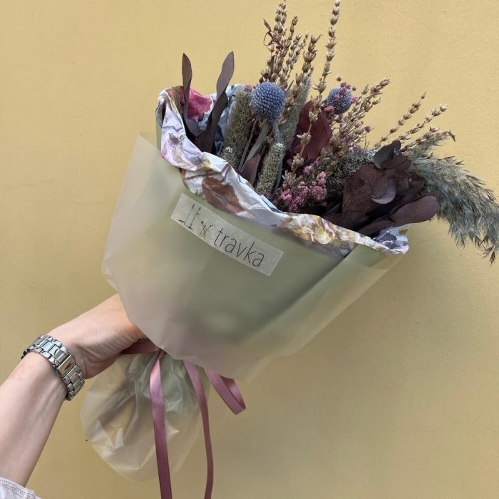 Краспедия – 2 шт.кортадерия – 1 шт.Эвкалипт – 3 шт.Лаванда – 10 шт.гипсофила сухоцвет – 5 шт.пушистики – 5 шт.