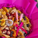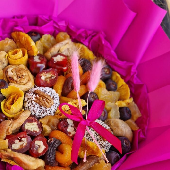 Курага – 140 гр.Финики – 100 гр.манго вяленое – 30 гр.чурчхела – 1 шт.сухофруктовые конфеты – 2 шт.ананас вяленый – 57 гр.дыня хаштаг – 1 шт.Инжир – 100 гр.грушаперсик – 100 гр.Лагурус – 2 шт.