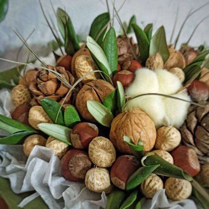 Хлопок искусственный – 5 шт.арахис в скорлупе – 35 шт.фундук в скорлупе – 40 шт.грецкий орех в скорлупе – 13 шт.шишка кедровая с орешками – 5 шт.олива (зелень) – 1 шт.робелини (зелень) – 1 шт.