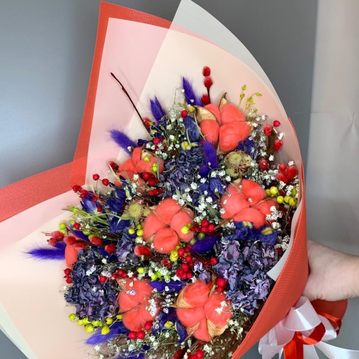 Хлопок – 7 шт.Лента атласная – 3 шт.Сухоцветы – 25 шт.Фетр – 3 шт.Лагурус (сухоцвет) – 18 шт.Салекс – 7 шт.Дизайнерская упаковка – 2 шт.гипсофила сухоцвет – 15 шт.абрус сухоцвет – 30 шт.