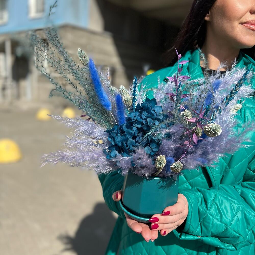 Композиция в керамическом кашпо с лагурусом,стабилизированной гортензией,мискантусом,кортадерией,пшеницей и фаларисом
