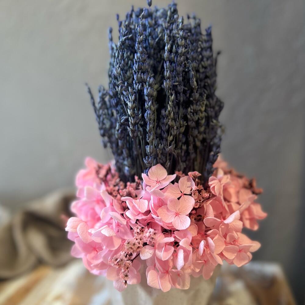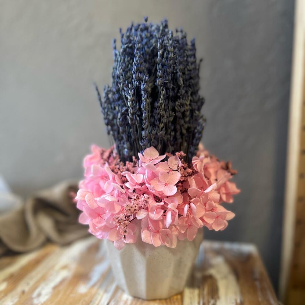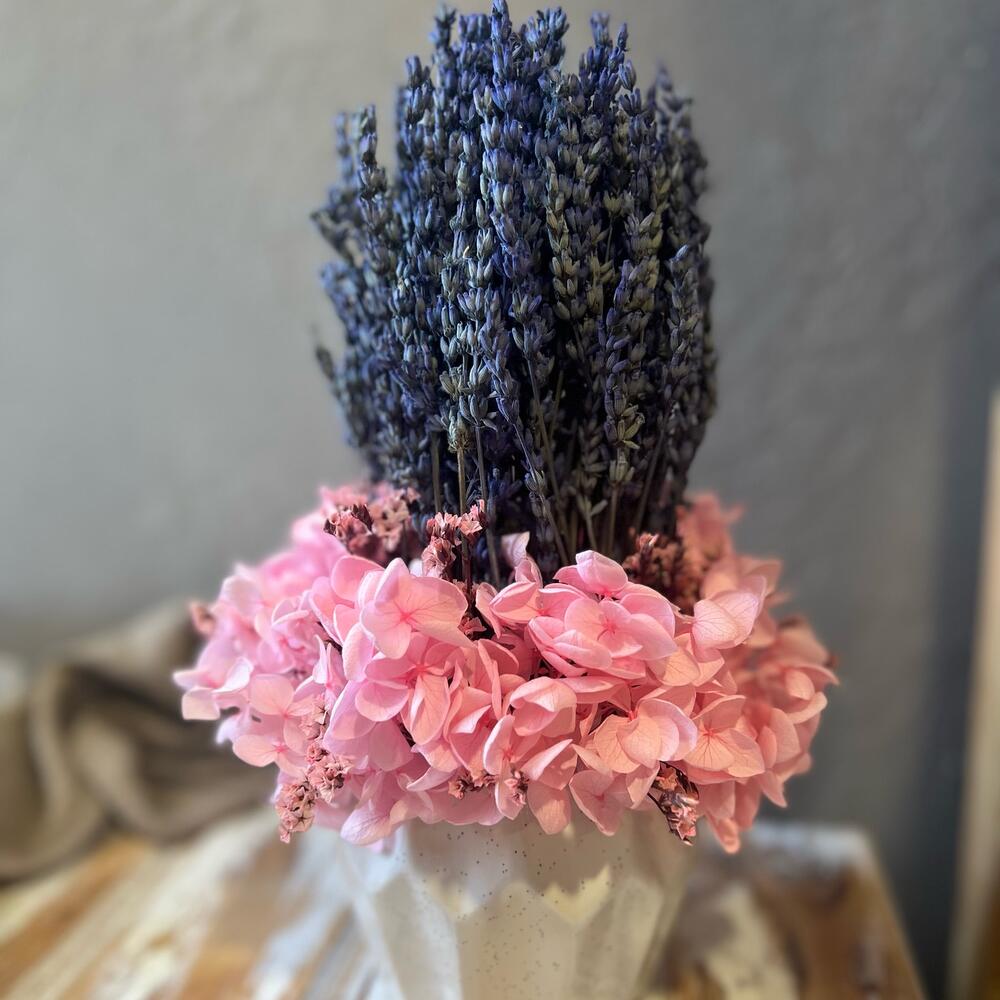 лаванда стабилизированная пучок – 1 шт.гортензия стабилизированная – 1 шт.Лимониум – 3 шт.Керамическое кашпо – 1 шт.