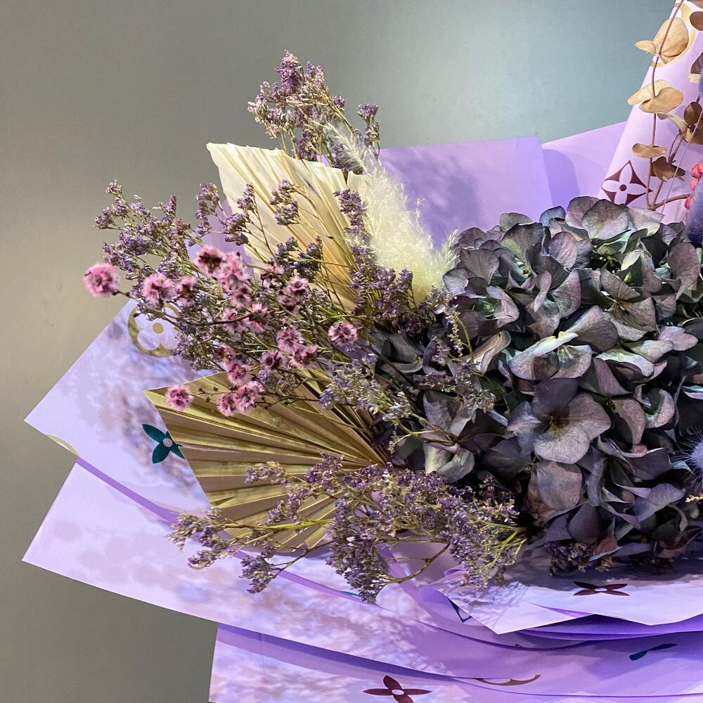 Гортензия – 1 шт.Лимониум – 4 шт.Лагурус – 20 шт.Лист пальмы – 2 шт.Эвкалипт – 2 шт.лен сухоцвет – 10 шт.пампасная трава – 1 шт.Лаванда (сухоцвет) – 20 шт.Пленка матовая – 5 шт.Лента атласная – 1 шт.